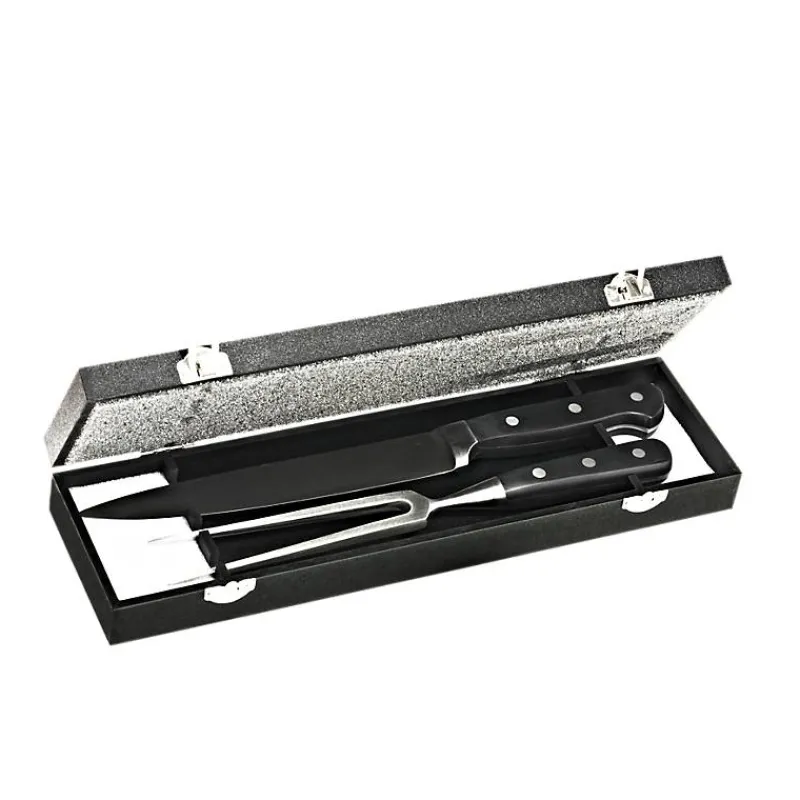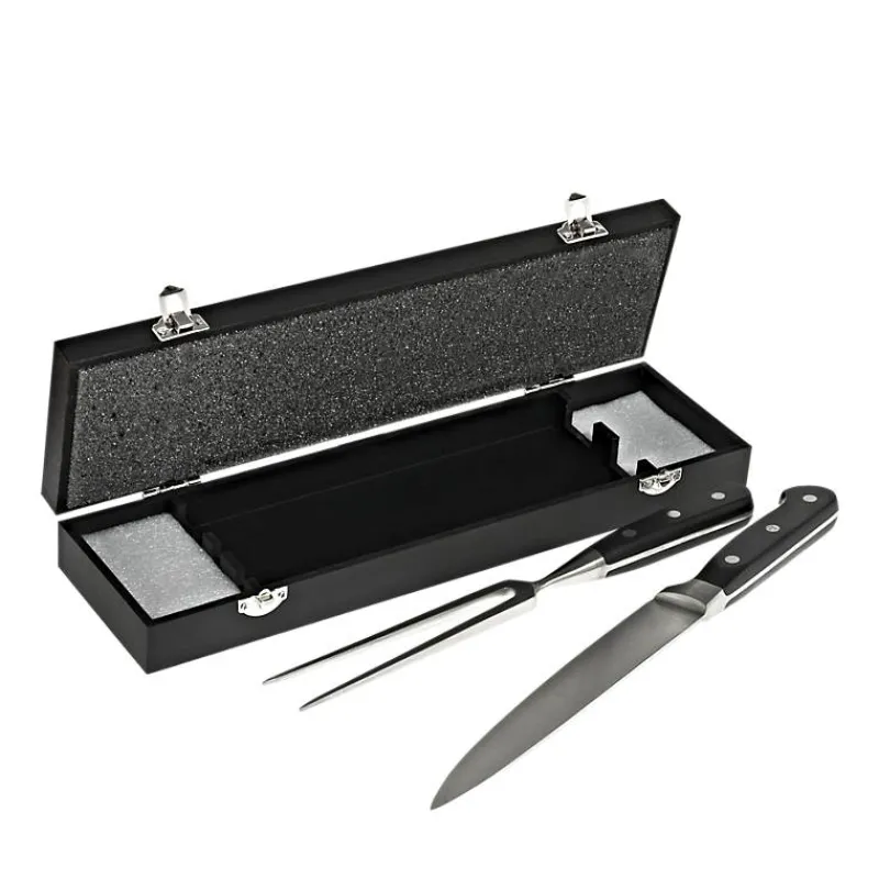 Extra scharf! Sorgen Sie mit diesem tollen Set bei Ihren Kunden für ein besonderes Tranchiererlebnis. Egal ob Sie mit dem extra scharfen Messer und der Gabel die für sicheren Halt sorgt einen Sonntagsbraten anschneiden oder die Festtagsgans tranchieren, hiermit geht dies alles mühelos. Durch die schöne schwarze Holzbox ist das Set immer gut verwahrt. Einzeln verpackt im Karton.