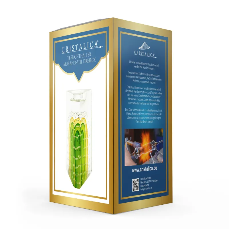 Erleben Sie die zeitlose Schönheit und handwerkliche Perfektion des Murano-Stils mit diesem exquisiten Teelichthalter in Dreieckform. Dieses dekorative Kunstwerk verbindet traditionelle Glaskunst mit modernem Design und bringt so einen Hauch von italienischer Eleganz in Ihr Zuhause.