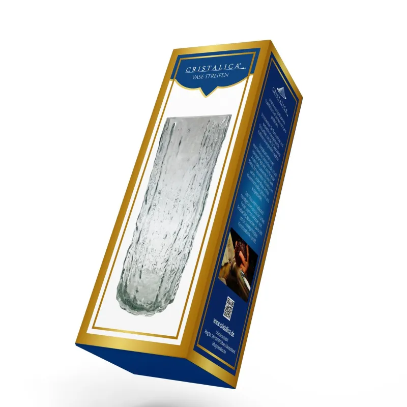 Das einzigartige transparente Streifen-Design verleiht der Vase einen modernen und zugleich minimalistischen Look, der sich nahtlos in jedes Interieur einfügt. Die klaren, sanft geschwungenen Linien der Streifen schaffen ein harmonisches Zusammenspiel von Licht und Glas, wodurch die Vase sowohl bei direkter Beleuchtung als auch bei sanftem Tageslicht ein beeindruckendes Lichtspiel erzeugt.