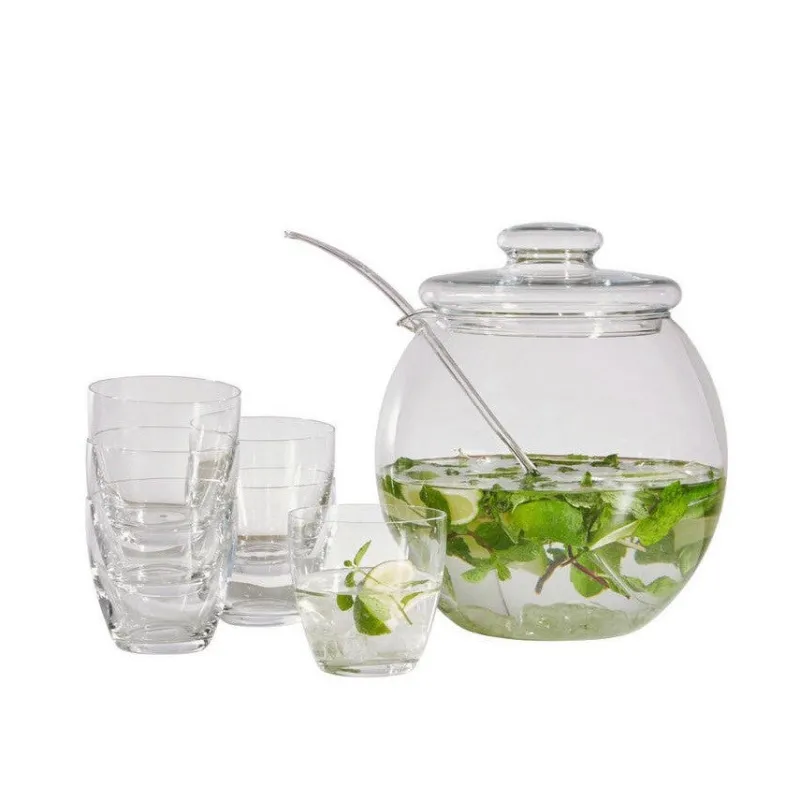 Dieses wunderschöne Bowle-Set ist ist ein Must Have auf jeder Gartenparty. Das Set beinhaltet ein Bowlegefäß mit Deckel, ein Kelle aus Kunststoff und sechs Becher aus Kristallglas. Das Set können Sie das ganze Jahr über nutzen, da es aus hitzebeständigem Glas gefertigt ist. So servieren Sie ihren Gästen in der warmen Jahrszeit eine kühle, erfrischende Fruchtbowle und im Winter einen heißen Punsch. Durch die Geschenkbox ist es auch ein beliebtes Geschenk zur Einweihung oder zum Geburtstag.
