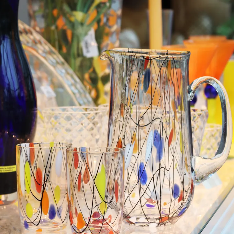 Perfekt zum Servieren von kalten Getränken wie Limonade, Wasser oder aber auch Wein geeignet. Mit den passenden Gläsern eine schöne Kanne für das Esszimmer oder draußen auf der Terrasse. Das Besondere an der Serie ist das nachträglich aufgebrachte erhabene Fadendekor. Die Glasserie Maria wird in Handarbeit aus hochwertigem Kristallglas gefertigt und ist der Hingucker auf jedem gedeckten Tisch. Abweichungen in Form und Farbe sind keine Fehler oder Mängel. Sie bereichern diese handgefertigten Produkte und sind die Handschrift der Glaskunst – es handelt sich um ein Unikat.