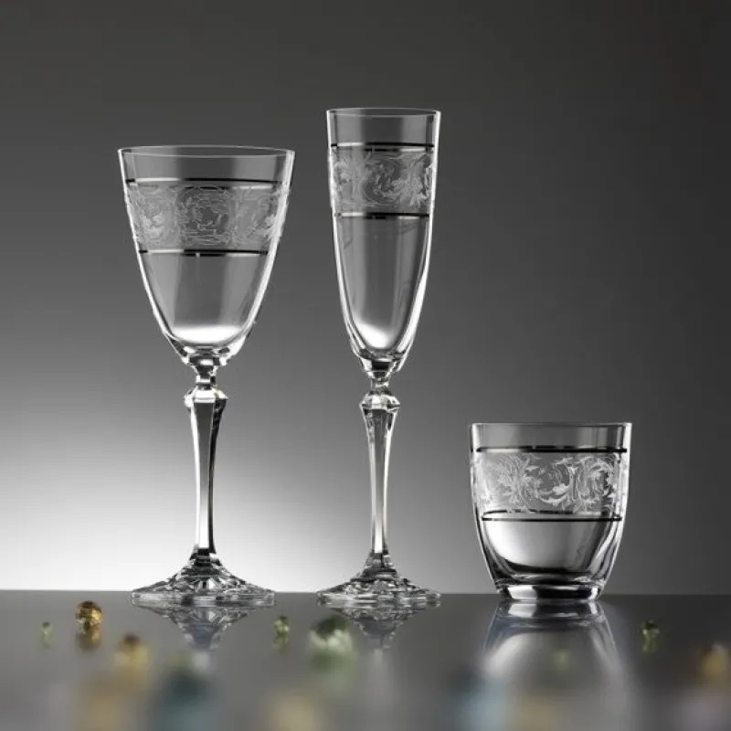 Holen Sie sich das prinkvolle Zeitalter des Rococo nach Hause. Das mit Pantographie und Platin dekorierte Kristallglas wird durch die Eleganz der Gläser abgerundet. Mit der Serie setzen Sie einen prachtvollen Akzent auf ihrem gedeckten Tisch. Erhältlich sind die Gläser einzeln als auch in einem 6er-Set.