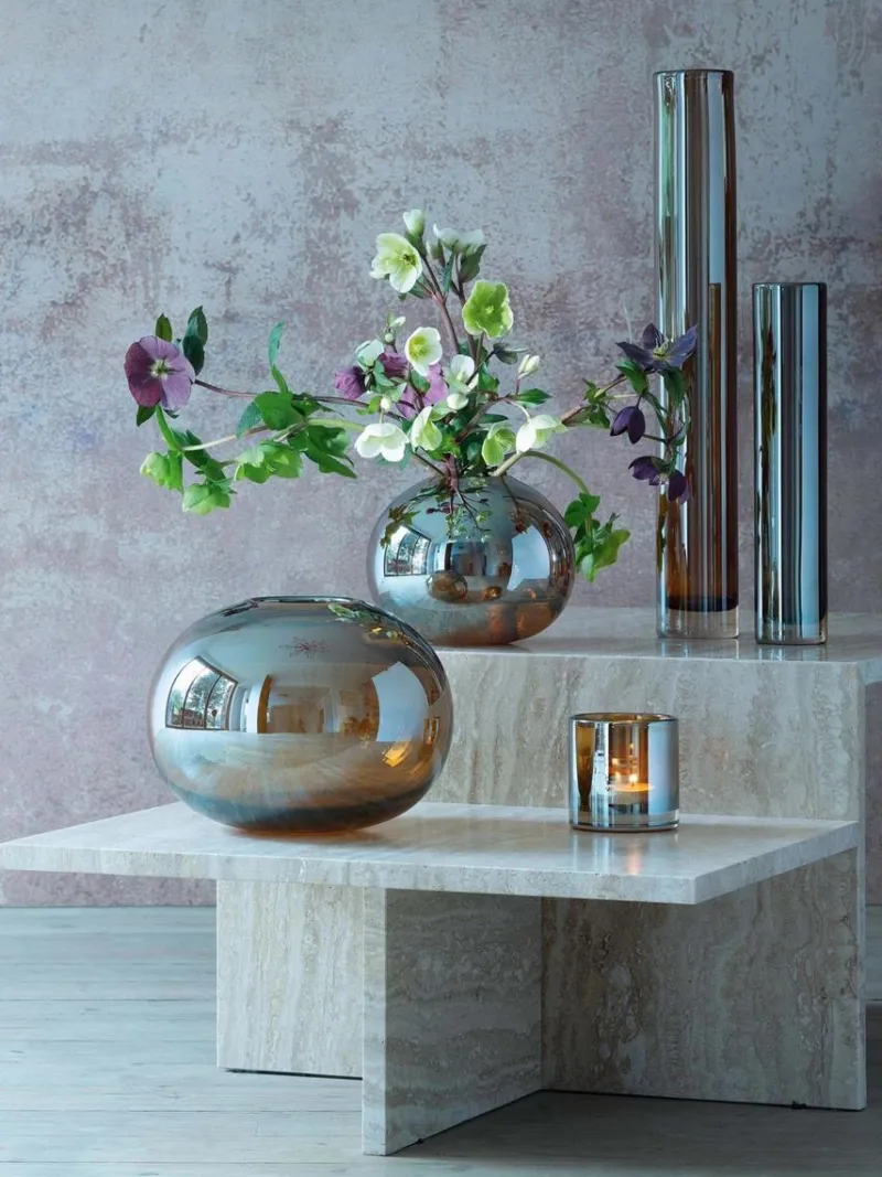 Die opulenten Glasvasen und Kerzenhalter der Serie Epoque sind mundgeblasen, Der dicke massive Boden sorgt für einen guten Stand. Der schillernde Glanz, welcher noch im heißen Zustand, von Hand, auf das Überfanglas aufgetragen wird macht die Serie zum absoluten Eye-Catcher.